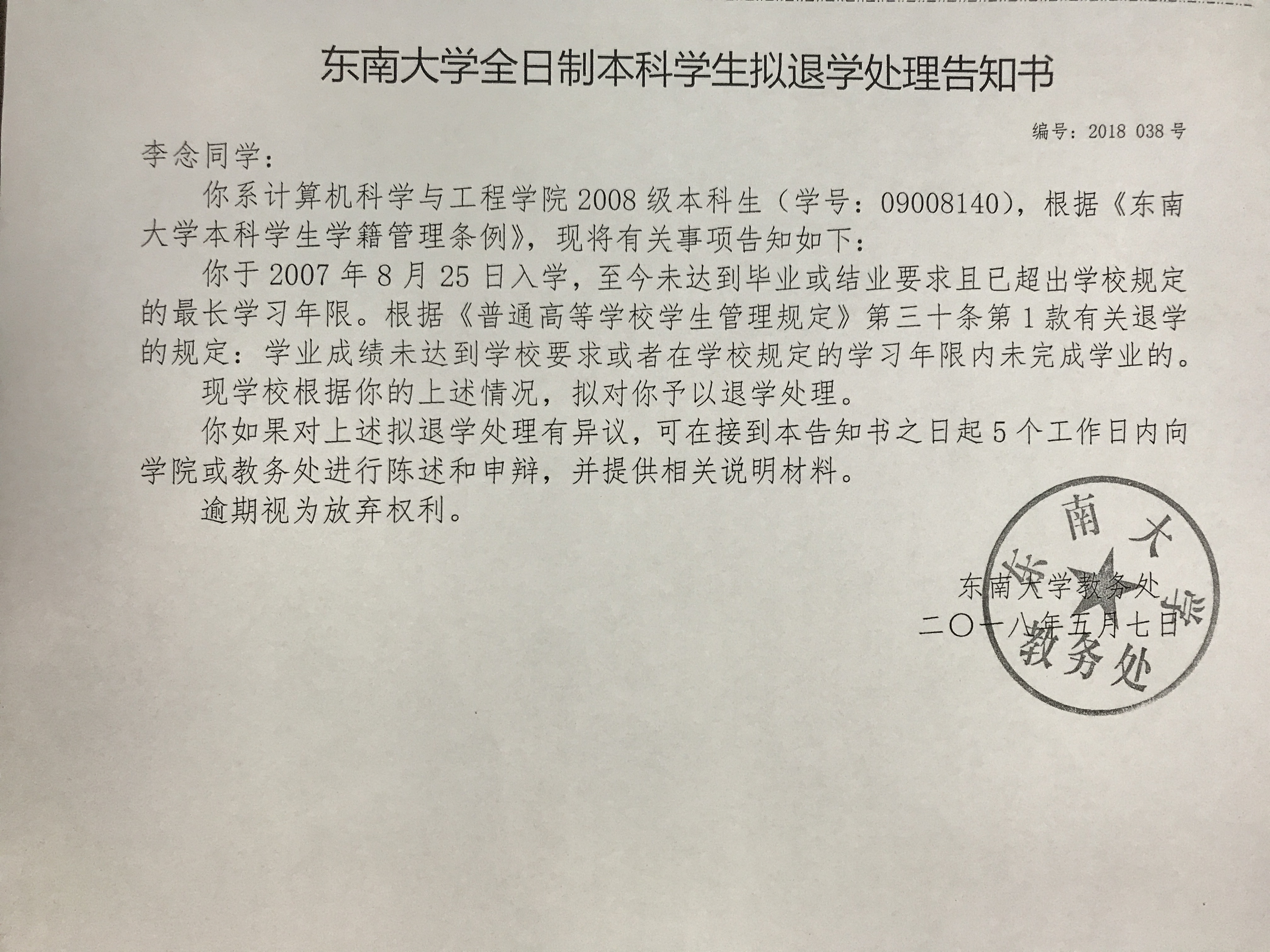 《关于拟对李念、李睿等二位同学作出退学处理的告知书》已于2018年05月08日发至所在学院,因学院无法与学生本人取得联系,用其他方式亦无法将其送达,现将《关于拟对李念、李睿等二位同学作出退学处理的告知书》予以公告。自本公告发出之日起,满15个工作日,视为送达。