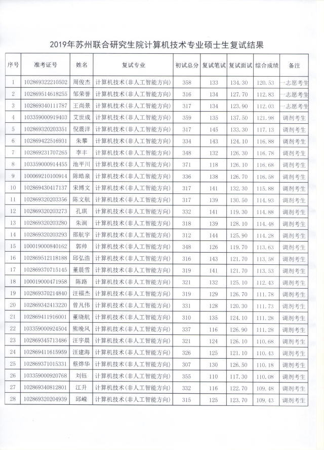 2019年苏州联合研究生院计算机技术专业硕士生复试结果
