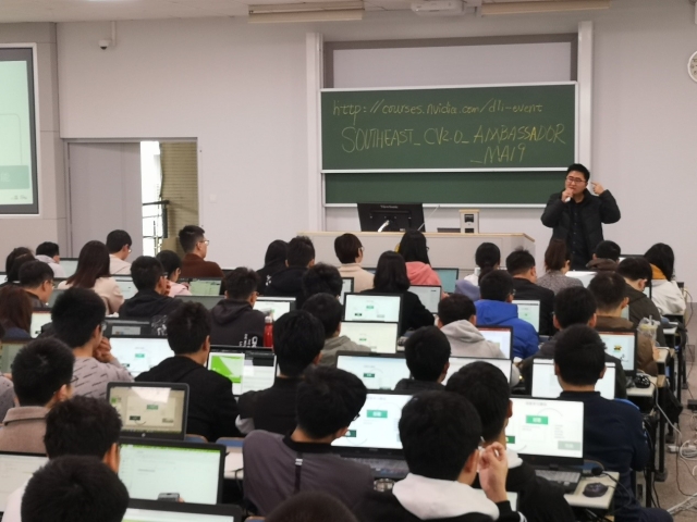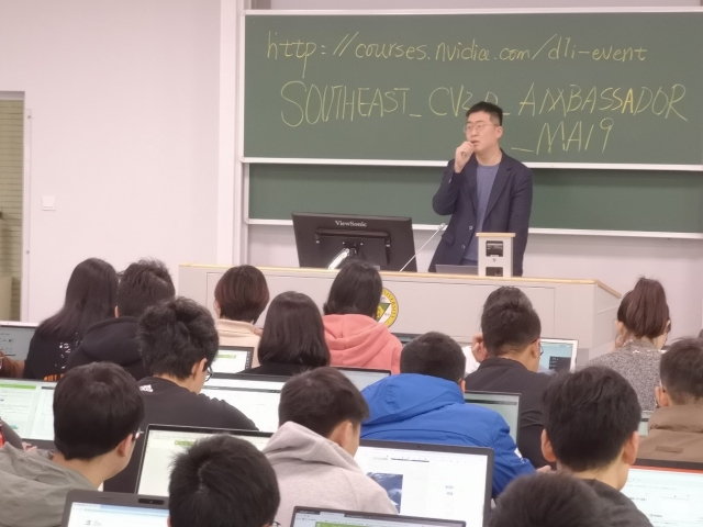 本次课程采用“理论+实践”的授课模式,同学们在英伟达高级解决方案构架师付庆平专家的现场指导下,先学习深度学习相关的理论知识,再通过一系列动手实验将深度学习技术应用于一系列计算机视觉任务。学生们通过连接英伟达提供的云端 GPU 工作站,并利用通用的深度学习工具、框架和工作流程展开工作,以训练和部署神经网络模型,学生只需携带一台笔记本电脑即可快速投入学习。理论结合实践,让同学们在一天的时间内轻松入门深度学习。培训结束之后所有学员获得了由英伟达深度学习学院(DLI)颁发的培训证书。
