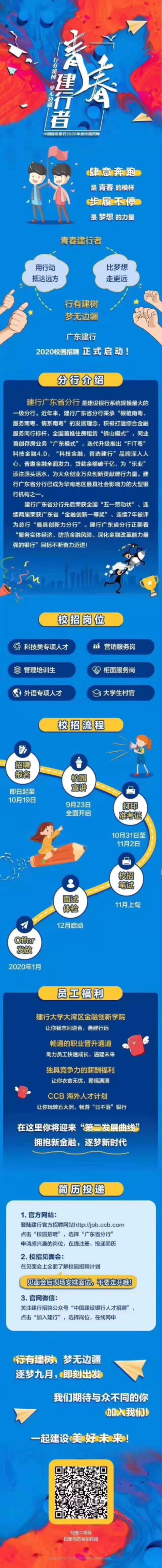 简历接收截止时间为10月19日,请有兴趣的同学登录【//job.ccb.com/】进入【校园招聘】选择【广东省分行】投递简历(岗位选择科技类专项人才),可同时关注招聘公众号【中国建设银行人才招聘】了解最新招聘动态。