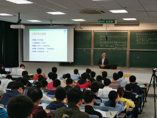 随后,耿老师介绍了人工智能的产生与发展,共包括5个时期,分别是孕育期(1956年前)、人工智能诞生(1956年)、推理期(1956——1960年代末)、知识期(1960年代末——1980年代末)和学习期(1980年代末——今)。图灵于1950年发表题为《计算机能思维吗?》的著名论文,论文中的“图灵测试”在现在也影响颇深。1956年的达特茅斯会议标志着人工智能这一学科的诞生。心理学小组、IBM工程小组、MIT小组在推理期各自发挥了自己的作用。知识期专家系统实现了人工智能从理论研究走向实际应用,从一般思维规律探讨走向专门知识运用的重大突破,是AI发展史上的一次重要转折。在学习期,大家发现人工智能系统所需知识不足和获取知识困难等问题可以让机器从大量示例中学习的方式来解决,决策树、支持向量机、神经网络等方法应运而生。AI研究中已形成了的不同学派,比如符号主义学派、连接主义学派、行为主义学派,他们的观点长短各异,应取长补短,综合集成。最后,耿老师简单介绍了机器学习、深度学习等现在人工智能领域的热门方向,但希望大家不要被当今的表面现象所迷惑,鼓励同学们学习人工智能的相关专业知识。
