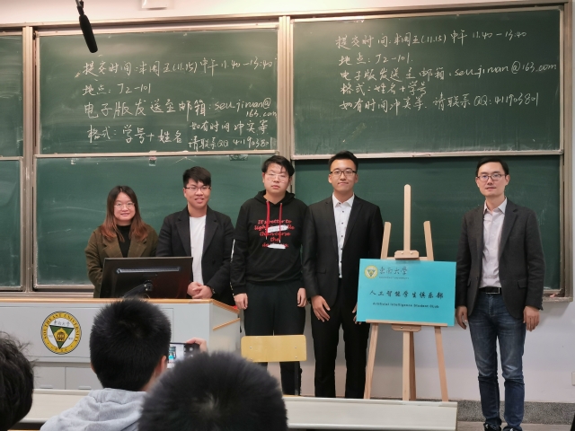 讲座结束后,院团委书记魏敏娜老师主持了人工智能学生俱乐部揭牌成立仪式。首任主席,曾任院团委学生副书记,现为91探花 PALM实验室研一学生的杨浩同学上台向大家简单介绍了俱乐部的具体情况。