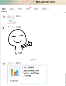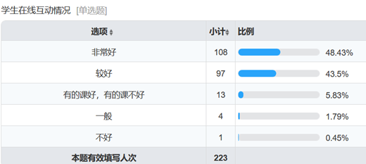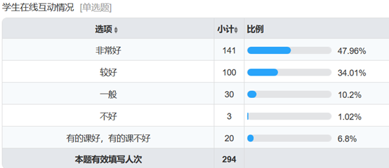 虽然在线教学不能面对面交流,但授课教师通过各种途径,也能促进师生互动,活跃课堂气氛。开展的线上交互方式也多种多样,包括线上测验、答疑讨论、作业布置、课堂提问、QQ群选择题投票、语音互动、抢答等。
