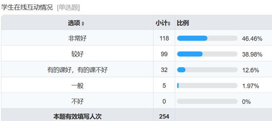 学生反馈表示,上课模式与线下教学效果相当,同学们有疑问也可以及时提问,老师也会及时解答,在线互动总体情况良好。