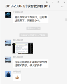 深入贯彻落实教育部、学校等各级部门关于在疫情防控期间做好在线教学组织与管理工作的指导意见,遵循“延期开学、如期教学、线上办公、柔性工作”原则,计软智学院成立本科线上教学工作组,在2019-2020-3学期延期开学期间,认真做好师生思想动员,充分发挥在线教学优势、整合教育资源,做好在线教学的组织管理与实施,最大程度保证计软智学院本科教学各项工作顺利进行。