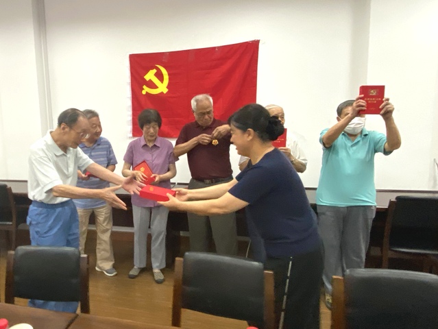 杨书记为6位老党员颁发“光荣在党50年”纪念章
