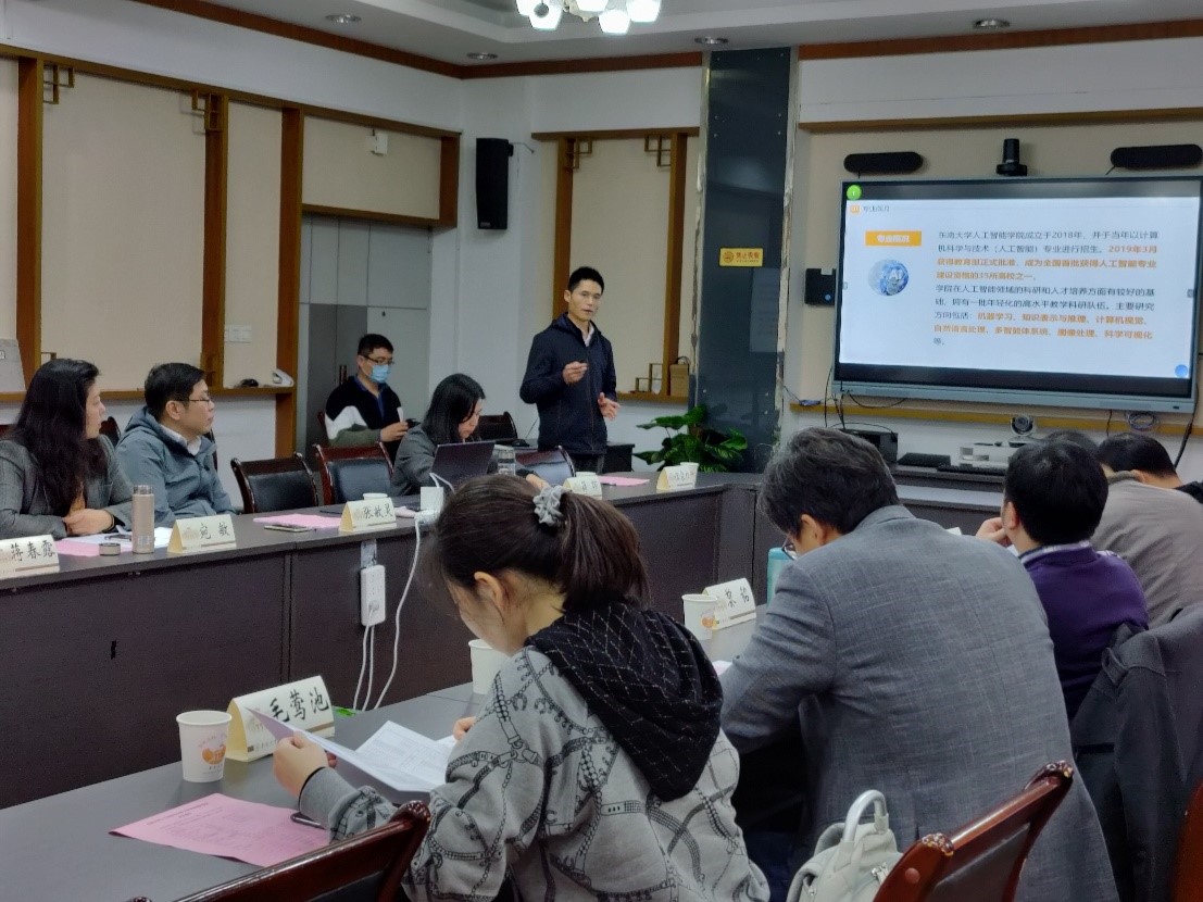 董永强副院长对人工智能专业建设情况进行汇报,主要包括专业概况、培养方案、教学条件、教学规范情况、教学质量保障、培养成效等六方面。