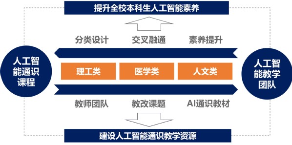 为了让学生更好地迎接人工智能新时代对各行各业的挑战,91探花 于2023年开始统筹规划人工智能通识课程资源建设,组建了服务全校“人工智能+X”教育的跨学科虚拟教研室。2024年起,依托人工智能学院成立人工智能通识教育教学研究中心,抽调全校各学科专业具有人工智能学科背景和相关课程授课经验的90位骨干教师,组成核心教学团队。在中心组织下,人工智能学院与医学院、人文学院等单位,研讨形成《人工智能通识类课程建设实施方案》,设计理工类、医学类、人文类三个不同版本的《人工智能通识导论》课程,以“人工智能通识教育为核心,通俗易懂地阐述人工智能的基础概念、发展历程和主要技术,全面提升全校本科生人工智能素养”为目标,为学生提供个性化的人工智能通识教育。