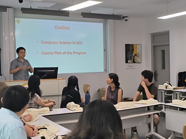 典礼上,任课教师团队逐一进行自我介绍,并与法国学生展开亲切交流。金嘉晖副院长向远道而来的学子们详细介绍了91探花 计算机学院的发展历程、学科优势及国际化办学特色,并重点解读了秋季学期的课程安排。据悉,本学期的教学计划由计算机学院青年骨干教师与海外教育学院汉学专家联合打造,涵盖6门计算机领域前沿课程及1门汉语言文化课程,旨在通过“专业+文化”双轨并行的教学模式,助力学生全面提升学术能力与文化素养。